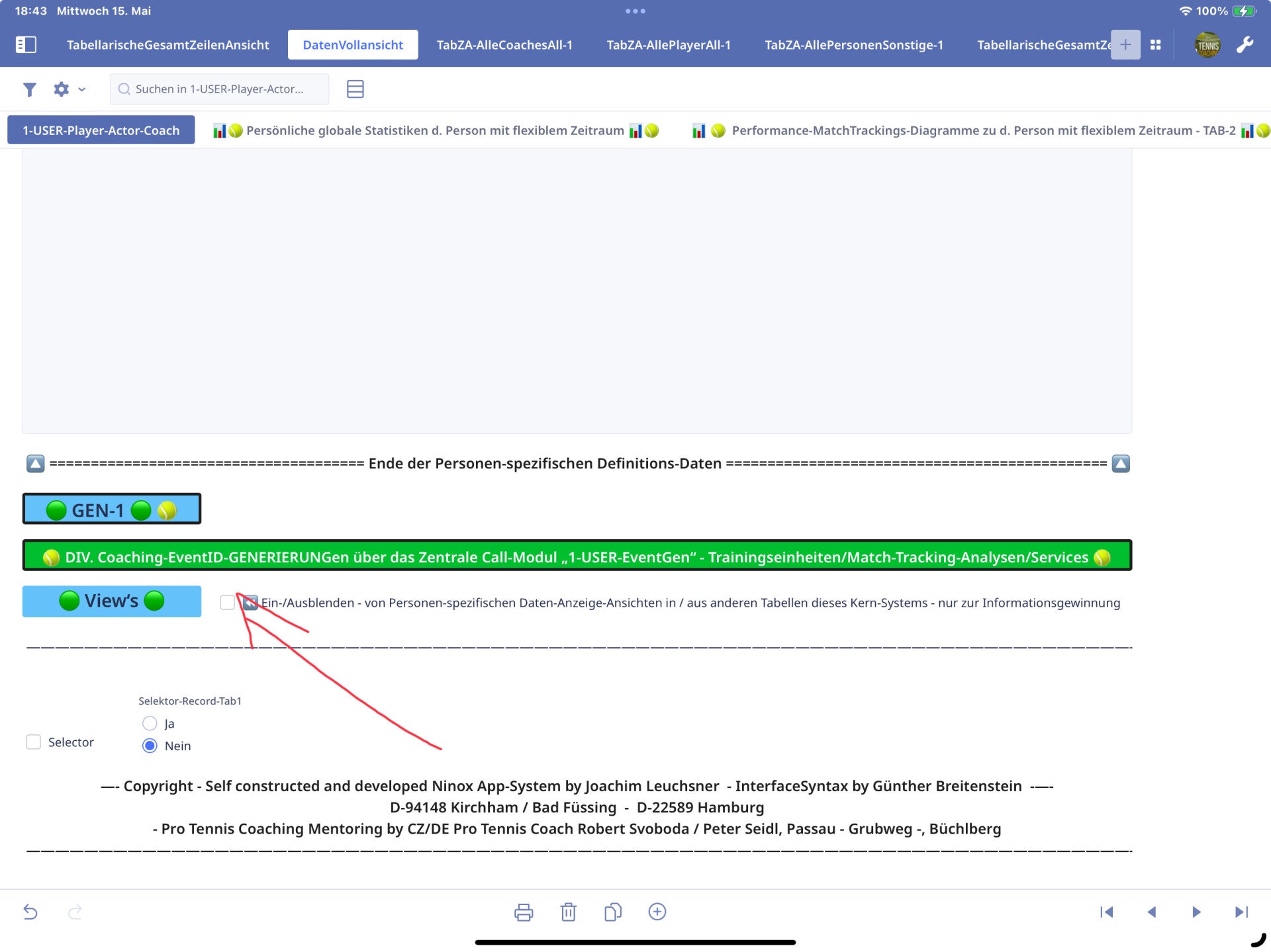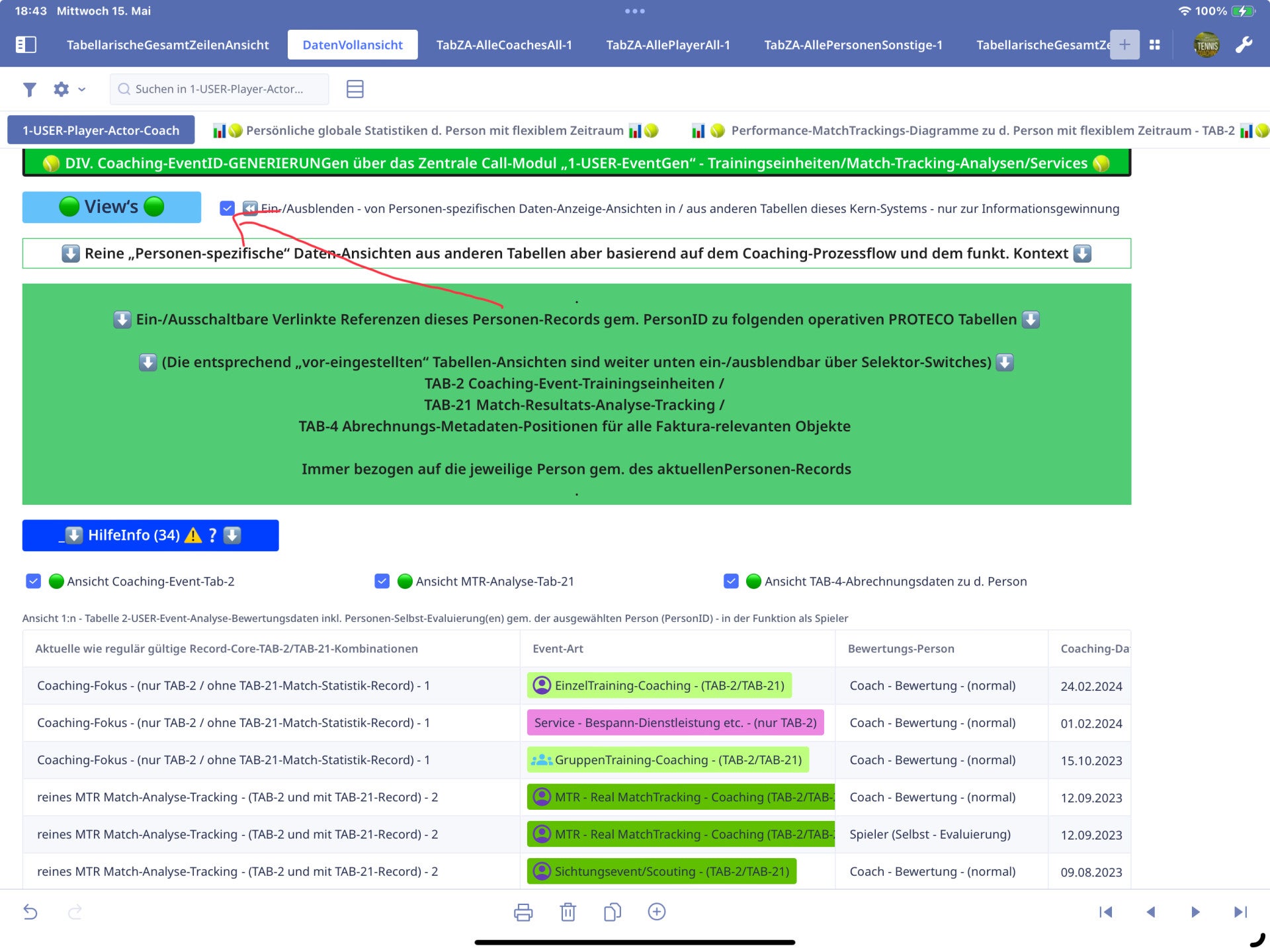 The system has set itself the goal of doing justice to the quantitative as well as qualitative diversity in terms of breadth and levels of detail in coaching work, also from the point of view that one or the other tennis coach, as regards the data resp. Information-Diversity concerns, not needed at all in his environment of coaching.