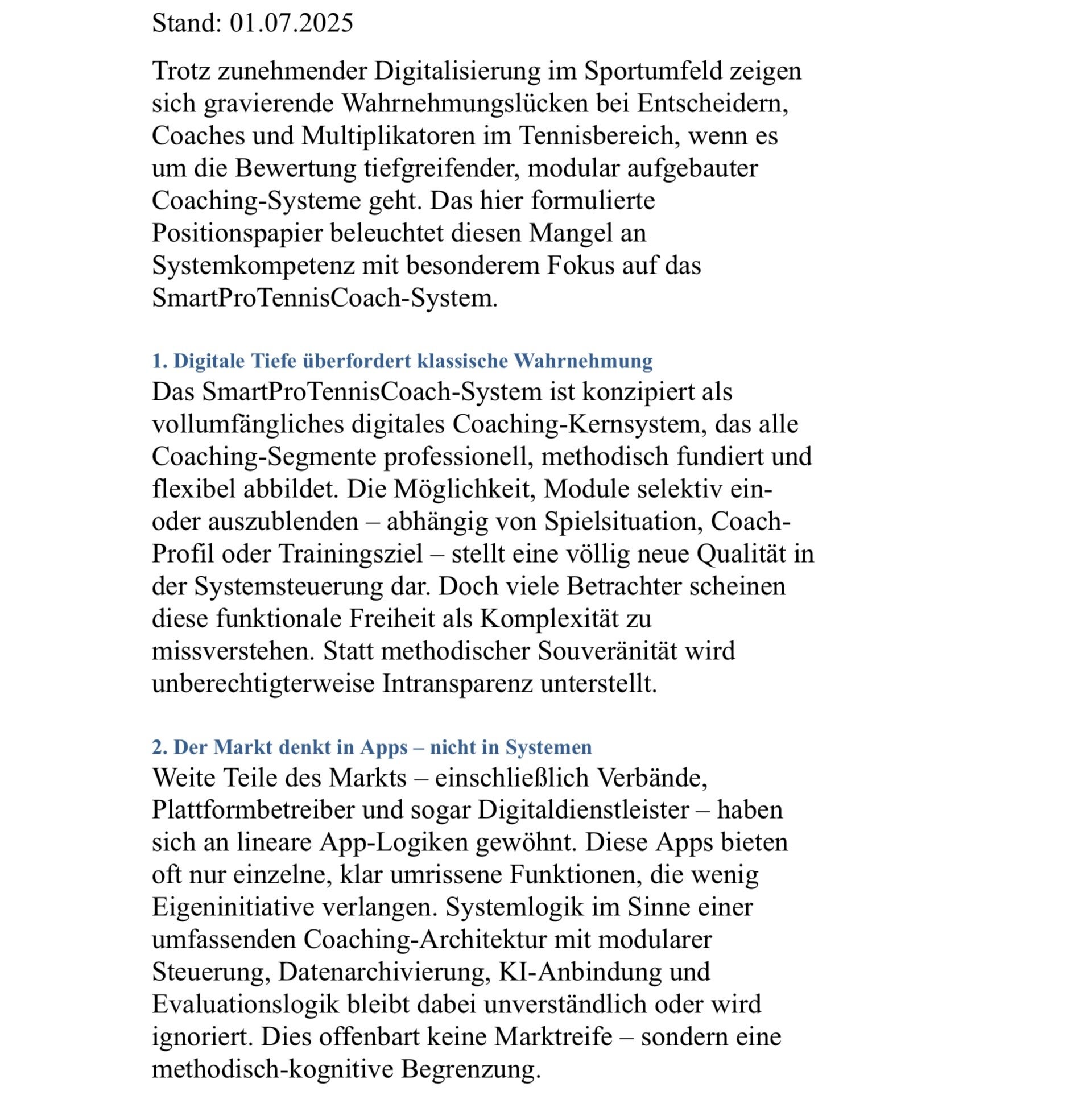 „Digitalisierung im praktischen wie individuellen Tennis-Coaching“ - „Was Wie gehen kann …. - Was nicht geht …. - welche Reaktionen von Aussen zu diesem Thema ich „wahr genommen“ habe ….“