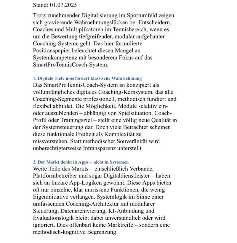 Ciò significa anche che tutto ciò che un allenatore di tennis trova da solo come "fornitore di conoscenze e informazioni" attraverso ulteriori funzioni digitali in linea con la sua attività di coaching e vorrebbe utilizzarle, può essere tecnicamente formalmente "integato" nel sistema complessivo in qualsiasi momento.