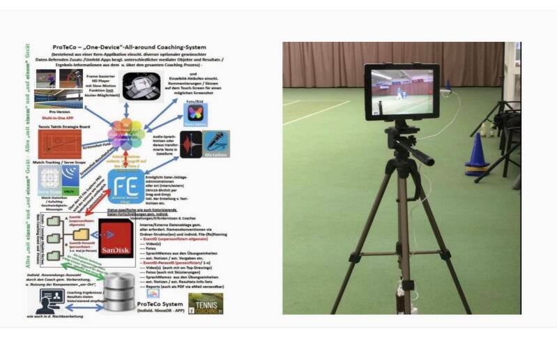 Ein komplettes Tennis-Coaching-System mit Einbindung von aktueller Videotechnik und sonstigen Features auf Tablet-Geräten, Planungen, Durchführungen und Auswertungen „in einer Hand“ und mit einem Gerät.