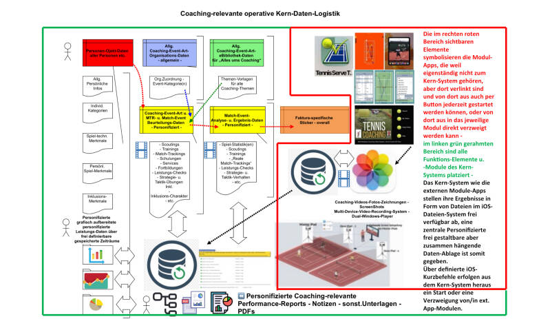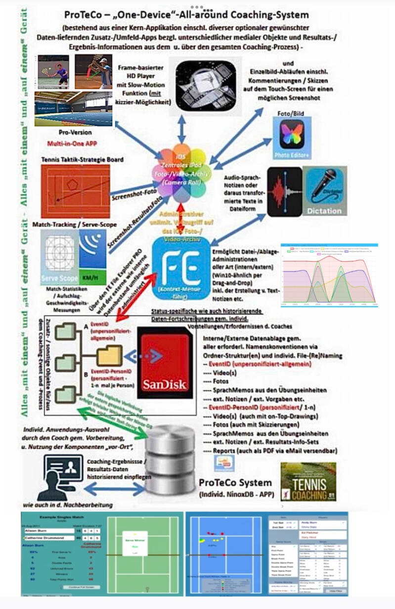 Ein umfangreiches professionelles Arbeitsgrundlagen-System, das den Charakter einer sog. herkömmlichen SMart-APP aufgrund der massiven und dennoch individuell händelbaren Funktionalitäten für den Tennis-Coach in jeglicher Form mehr als deutlich übertrifft …., denn hierbei handelt es sich um ein umfangreiches Anwendungs-System für professionelle Coaching-Arbeit, welches sich jederzeit auch zeitgleich bei Bedarf in die „MacBook-Welt“ zur „parallelen Arbeit“ z.B. portieren lässt, wenn dies erforderlich ist…, jedoch offeriert es funktional das alles schon primär auf „einem“ sehr einfach zu hand-habenden iPad Tablet als sog. „One-Device“ - Gerät ….