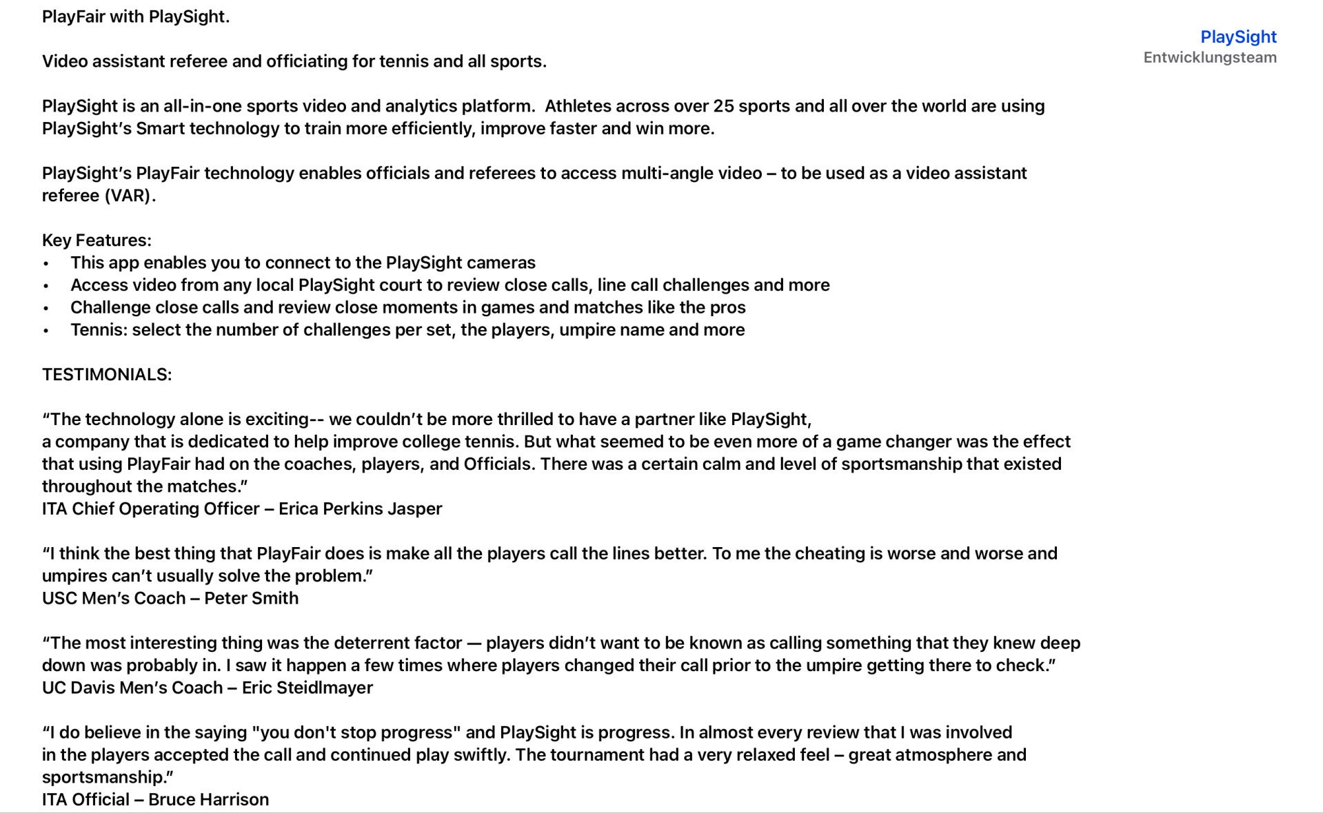 Hinweis: Im Juli 2025 wurde publiziert in Fachkreisen, dass Playsight sich in Richtung „reine Streaming-Plattform“ funktional verändern wird und dadurch auch einen „externen bisher verfügbaren Daten-Transfer“ in den Bereich „Coaching“ nicht mehr unterstützt.
