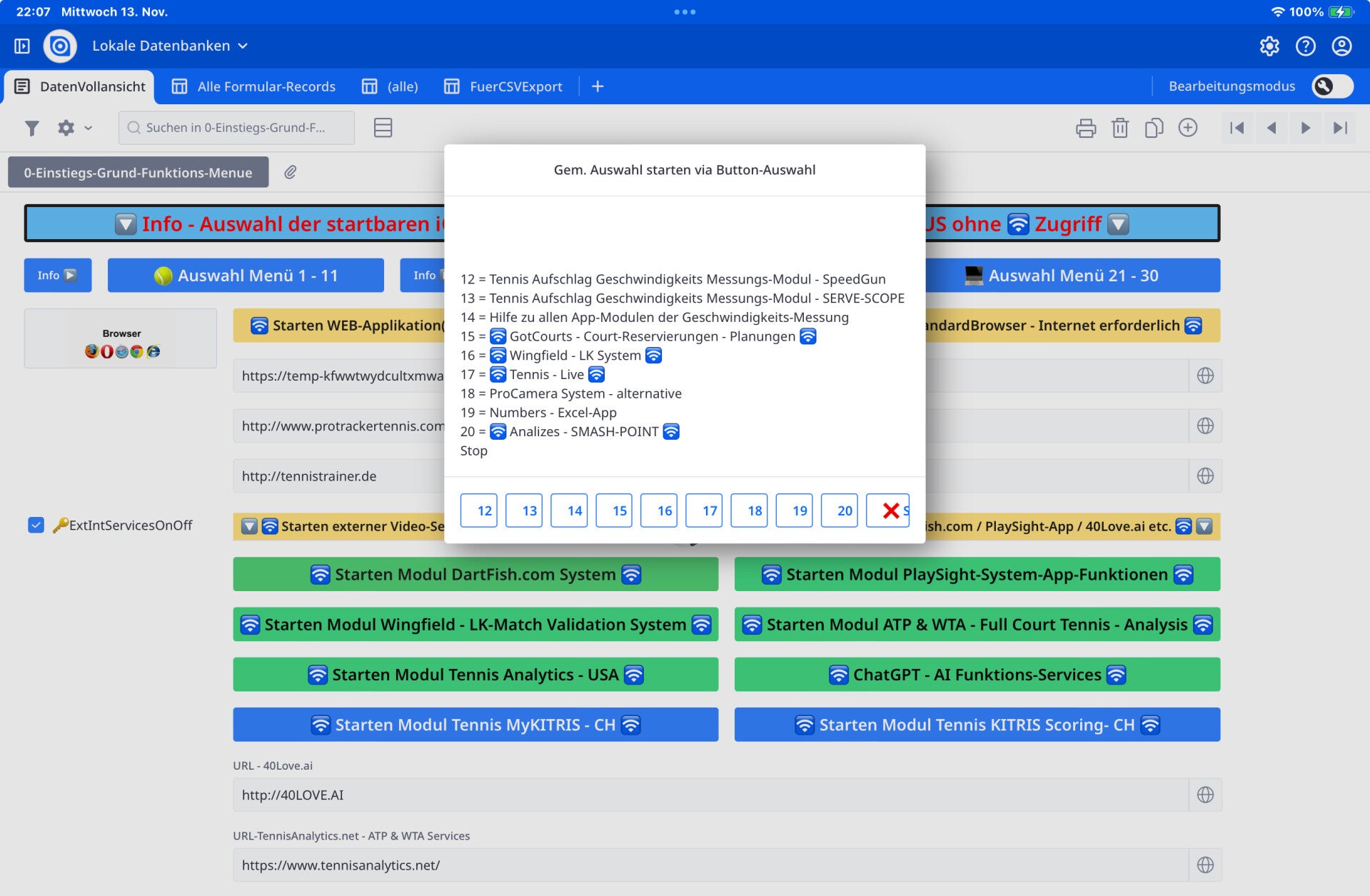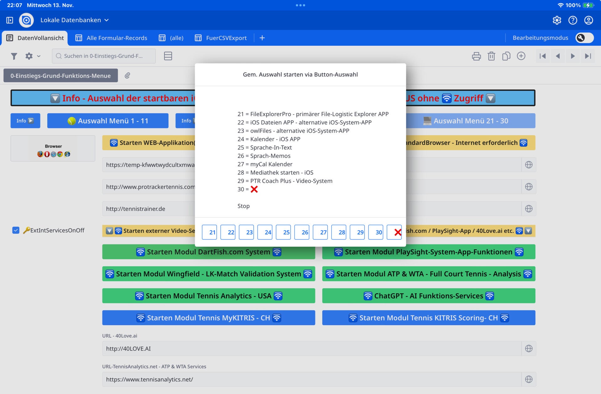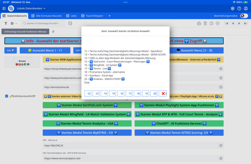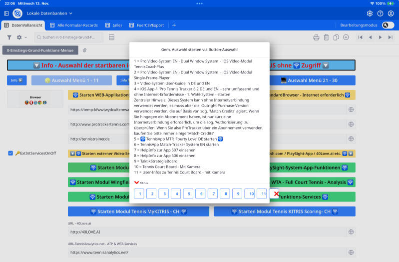 Das untere Bild zeigt in einem Drop-Down-Auswahl-Fenster alle verfügbar ansteuernden iOS Module und Hilfs-Tools, die die Arbeit des Coaches real-time unterstützend begleiten, für jeden spez. Augenblick wie Moment das optimale Tool zum praktischen Tun ….