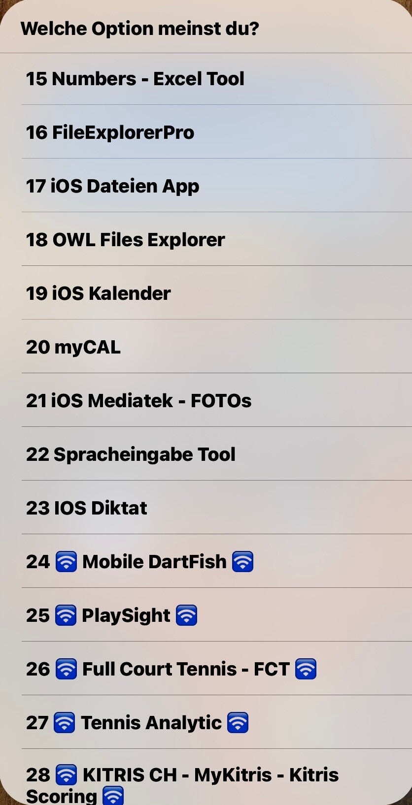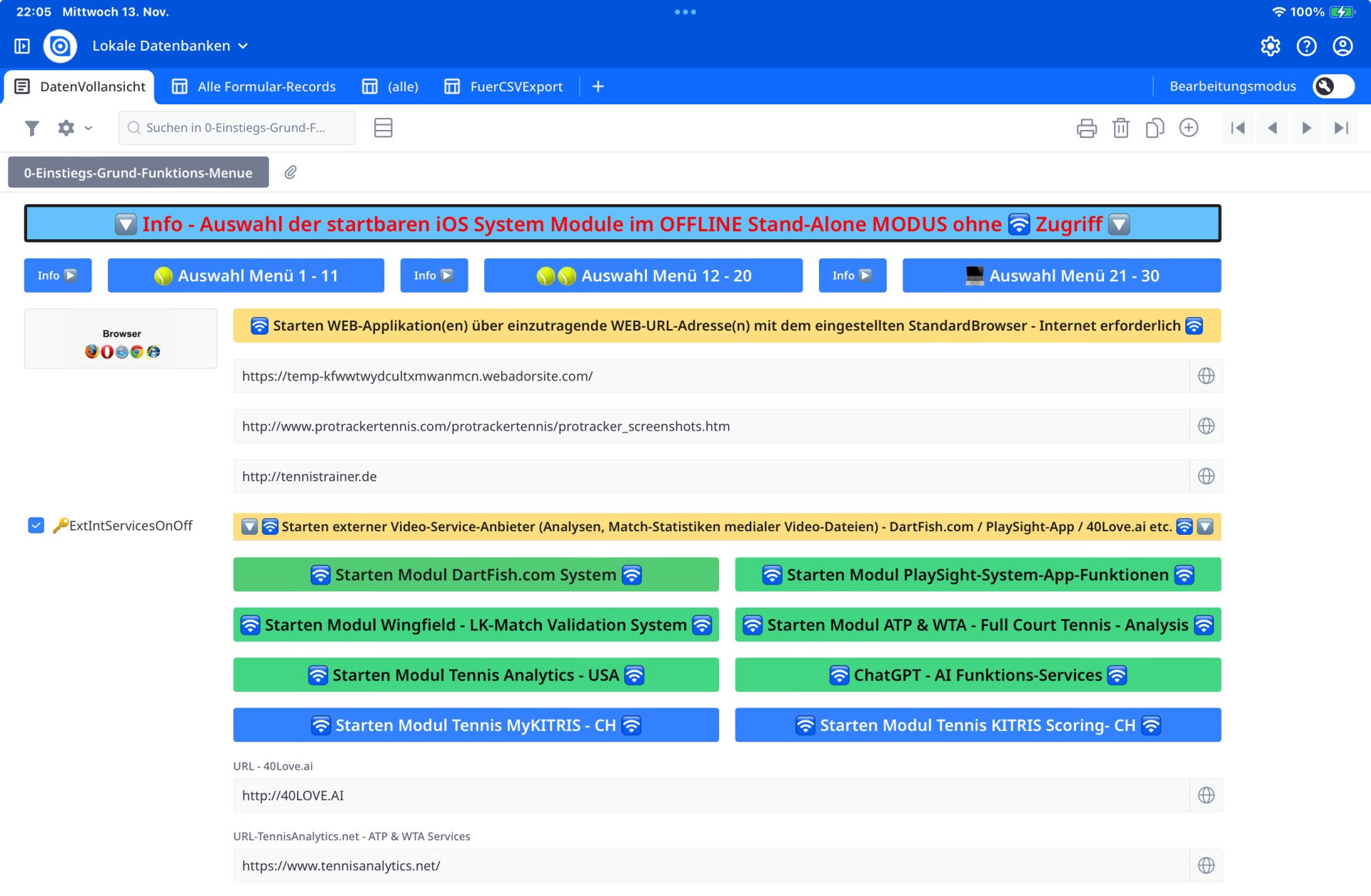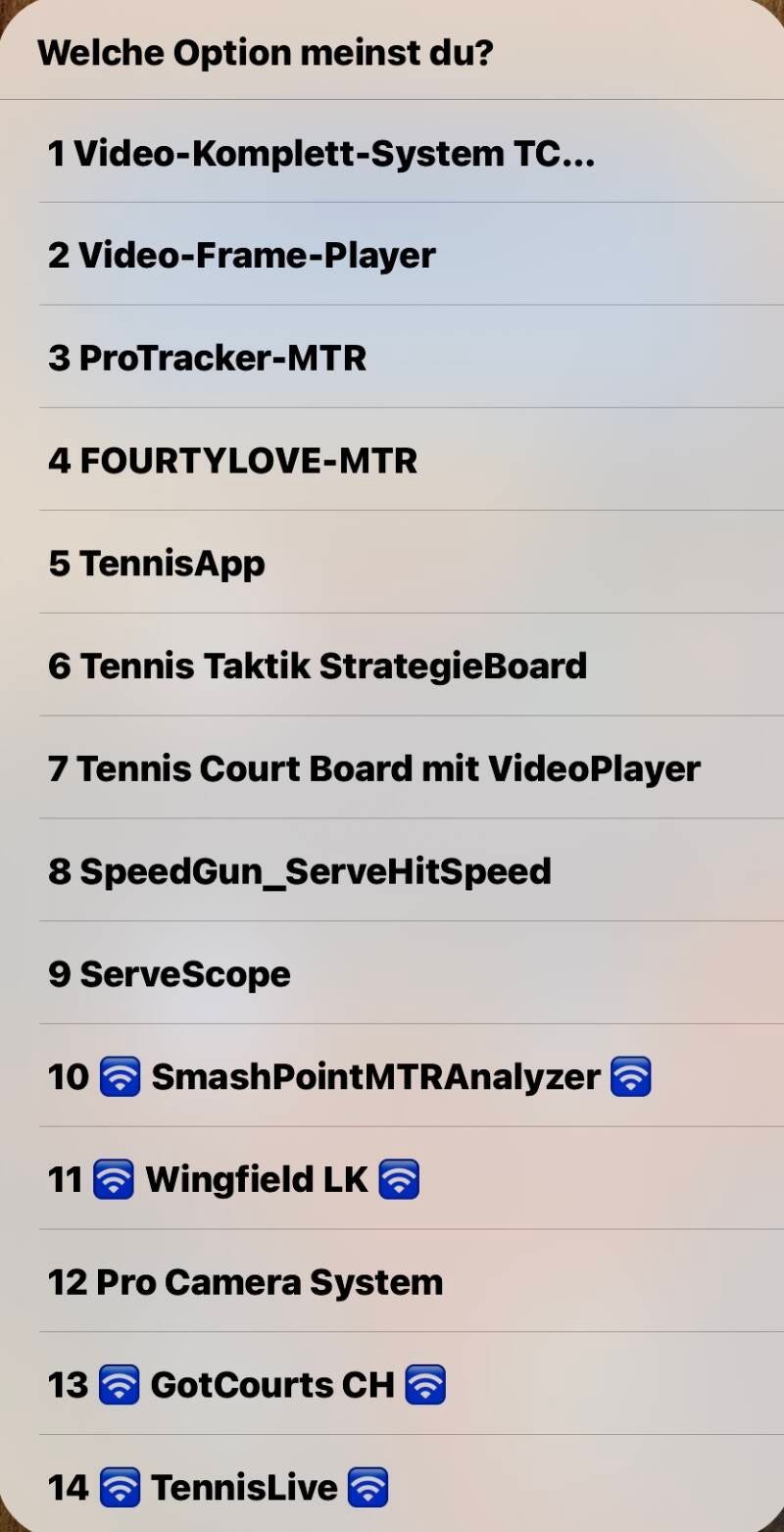 Das untere Bild zeigt in einem Drop-Down-Auswahl-Fenster alle verfügbar ansteuernden iOS Module und Hilfs-Tools, die die Arbeit des Coaches real-time unterstützend begleiten, für jeden spez. Augenblick wie Moment das optimale Tool zum praktischen Tun ….